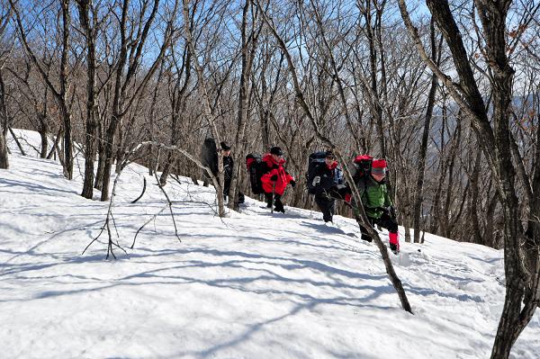 든든하게 아침을 먹고 제왕산 러쎌개척 산행을 시작하였다.