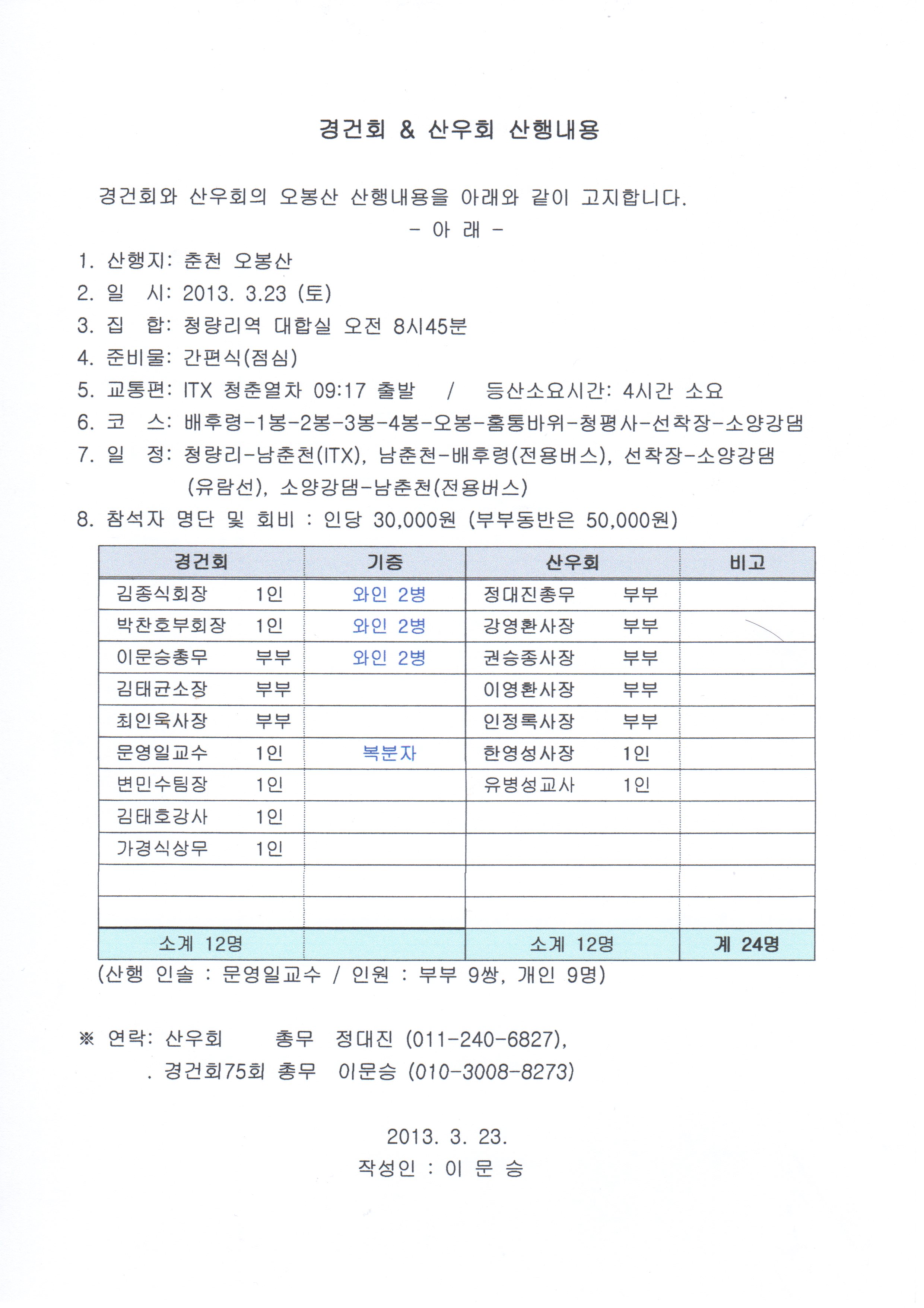경기고등학교 75회 동창회 -京建会&山友会 山行内容(2013.3.23)